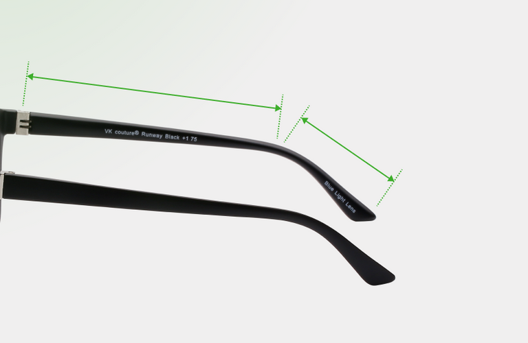 The arms, or temples, of your glasses are the parts that connect to the frame and sit on your ears. Temple lengths range from 120 to 150 millimeters (4.7 to 5.9 inches), but they generally come in three standard sizes: 135, 140, and 145 millimeters. As the overall width of your glasses increases, the length of the temples should also increase.