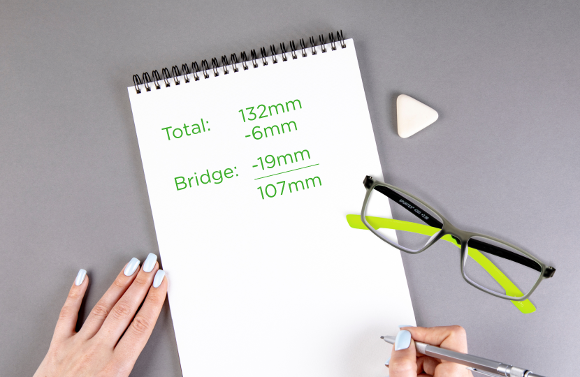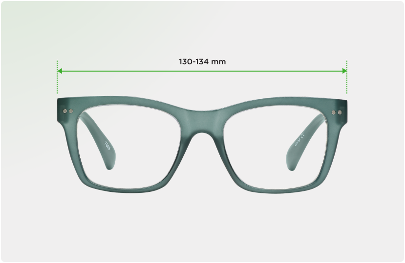 Make sure that the overall width of your glasses, which includes both lenses and the bridge, aligns closely with your temple-to-temple measurement. For example, if your temple-to-temple measurement is 132 millimeters (5.2 inches), look for glasses that measure between 130 and 134 millimeters (5.1 to 5.3 inches).